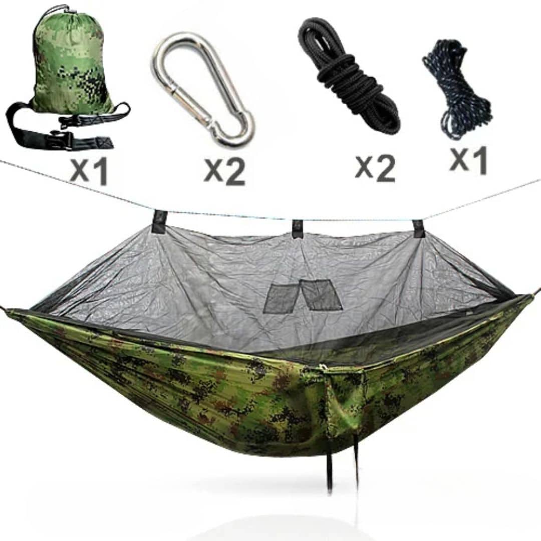 Plus qu’un simple hamac, ce modèle est équipé d’une moustiquaire qui vous protège efficacement contre les moustiques et autres insectes, assurant ainsi un sommeil paisible et sans interruption. La couleur verte du tissu ajoute à son efficacité en se camouflant dans des environnements boisés ou herbeux, tandis que le hamac lui-même reste accessible et confortable pour deux personnes.